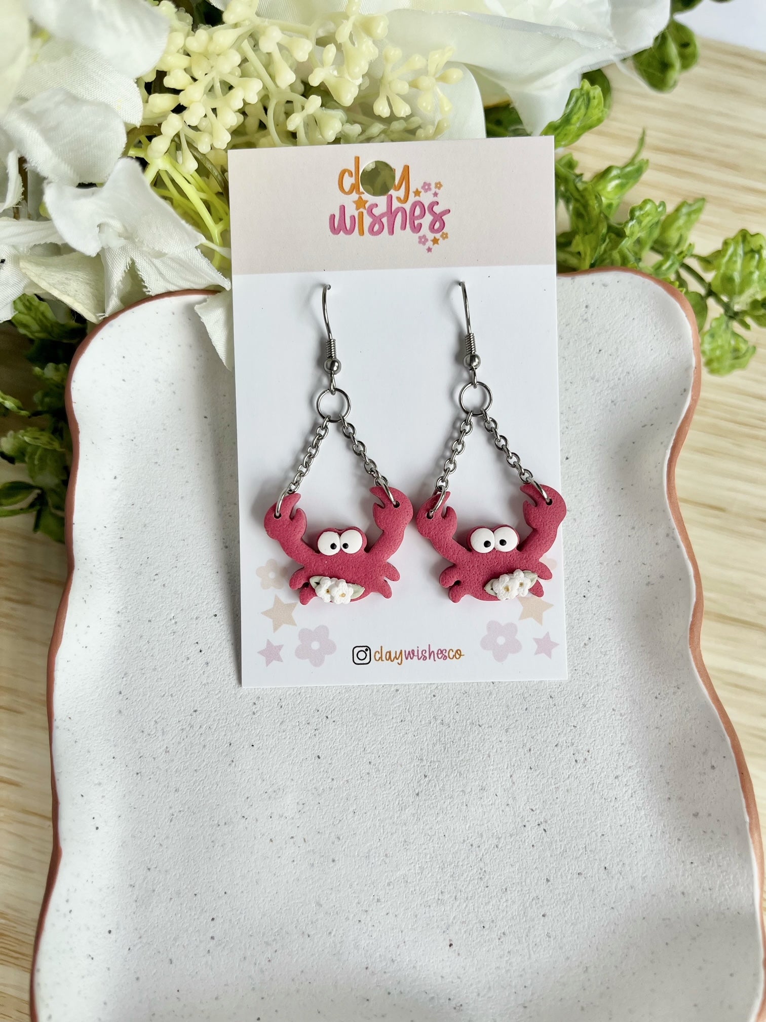 Make a splash with these adorable Crabby Cuties—handmade polymer clay earrings that bring beachy vibes and playful charm to any outfit! Earrings feature a tiny flowers and the cutest little eyes full of personality.
